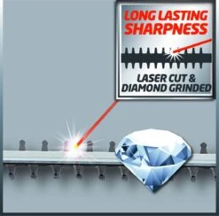 Voor een ergonomische manier van werken is de kop van deze telescoop heggenschaar kantelbaar. Zo kunnen hoge hagen ook aan de bovenzijde moeiteloos geknipt worden. Het snijblad van de machine is gemaakt met lasergesneden en diamant geslepen staal, voor een optimaal resultaat.