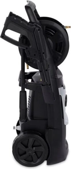 - De hogedrukreiniger heeft een stevige handgreep en wieltjes zodat je hem moeiteloos verplaatst. Het toestel heeft ook een pistoolhouder, zo hang je het pistool en de lans netjes weg als je klaar bent met je klus.