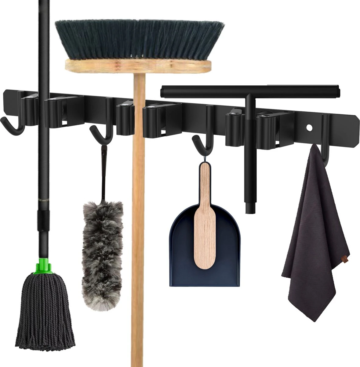 Met een lengte van slechts 38cm plaats je de bezemhouder zonder problemen op de kleinste plekken. En met 3 klemmen en 4 haken heb je voldoende ruimte voor de meest gangbare hulpmiddelen.